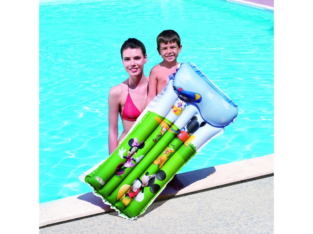 Nafukovací matrace Mickey Mouse o velikosti 119 × 61cm pro děti od 3 let. Opravná sada přiložena. Zabudovaný polštář pro větší pohodlí. przeczytaj całość