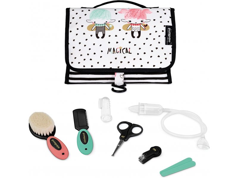 Sada obsahuje: hřeben, kartáč s přírodními štětinami, silikonový kartáček na první zoubky, odsávačku, dva pilníčky na nehty, nůžky a štípátko na nehty.