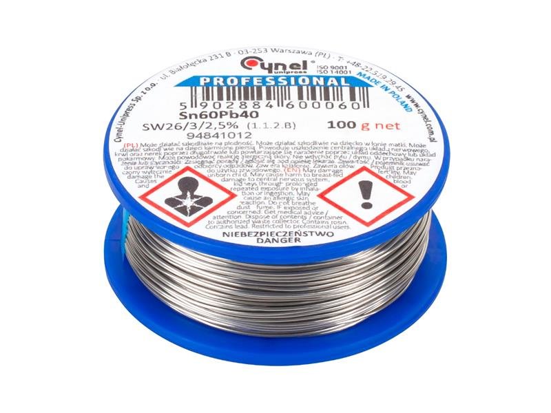 Cín je složen z 60% Sn a 40% Pb. Průměr drátu 1,5 mm.