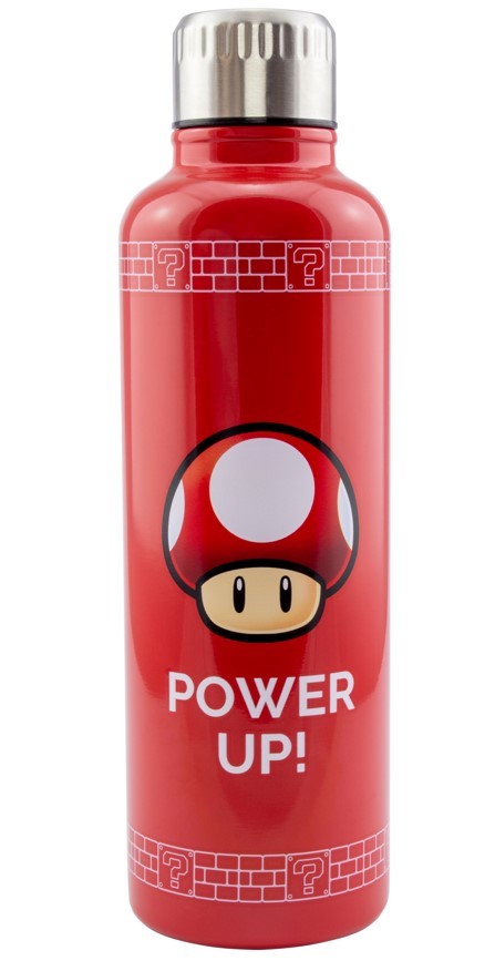 Czerwona, stalowa butelka do picia inspirowana grą wideo Super Mario.