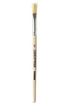 Płaski pędzel z włosiem syntetycznym, lakowaną drewnianą rączką z bezszwową aluminiową skuwką.