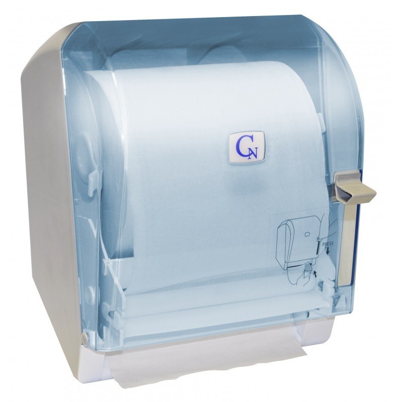 barva: modrá - průhledná Nástěnný zásobník na papírové ručníky v roli o rozměru: pr. 20x20 cm s dutinkou o průměru 36 – 45mm odvíjené. Je vhodný do provozů, kde je velká spotřeba.