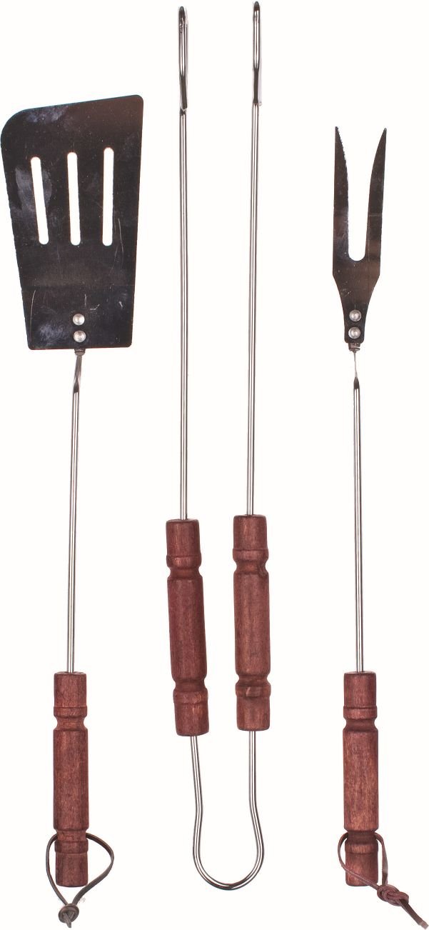 3dílná sada grilovacího náčíní obsahuje kleště, obracečku a vidličku z pochromované oceli. Rukojeť je ze dřeva. Sada obsahuje základní nářadí potřebné při grilování. Nářadí je vybaveno poutky pro zavěšení. Rozměry - délka 46cm, 46,5cm, 44cm. przeczytaj całość