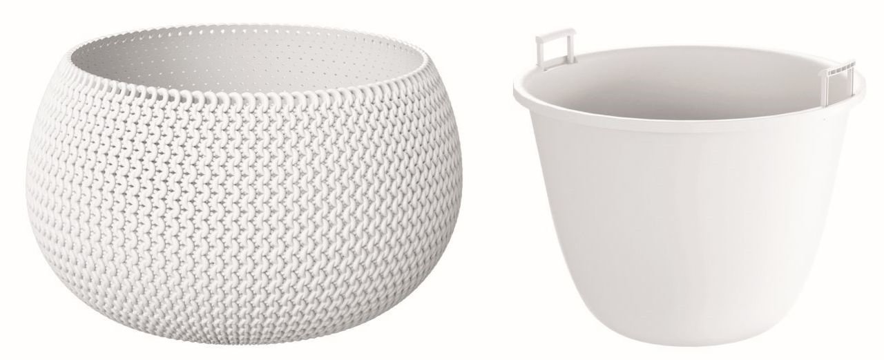 Květináč Splofy se vyznačuje vyřezávaným úpletem, který vkusně obohatí každý interiér. Pozornost upoutává svou strukturou na povrchu, ta je příjemná na dotyk. Věrně imituje úplet z příze. Odpovídá aktuálním trendům. Součástí je vložka na zasazení rostliny. Květináč je vhodný pro celoroční venkovní i vnitřní použití. Barva - bílá. Materiál - plast. Rozměry - objem 9 l, průměr 37 cm, výška 21,8 cm.