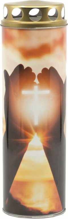 Hřbitovní svíčka s dekorem kříže v dlaních. Doba hoření - 3 dny. Parametry - hmotnost 225 g, výška 21 cm. przeczytaj całość