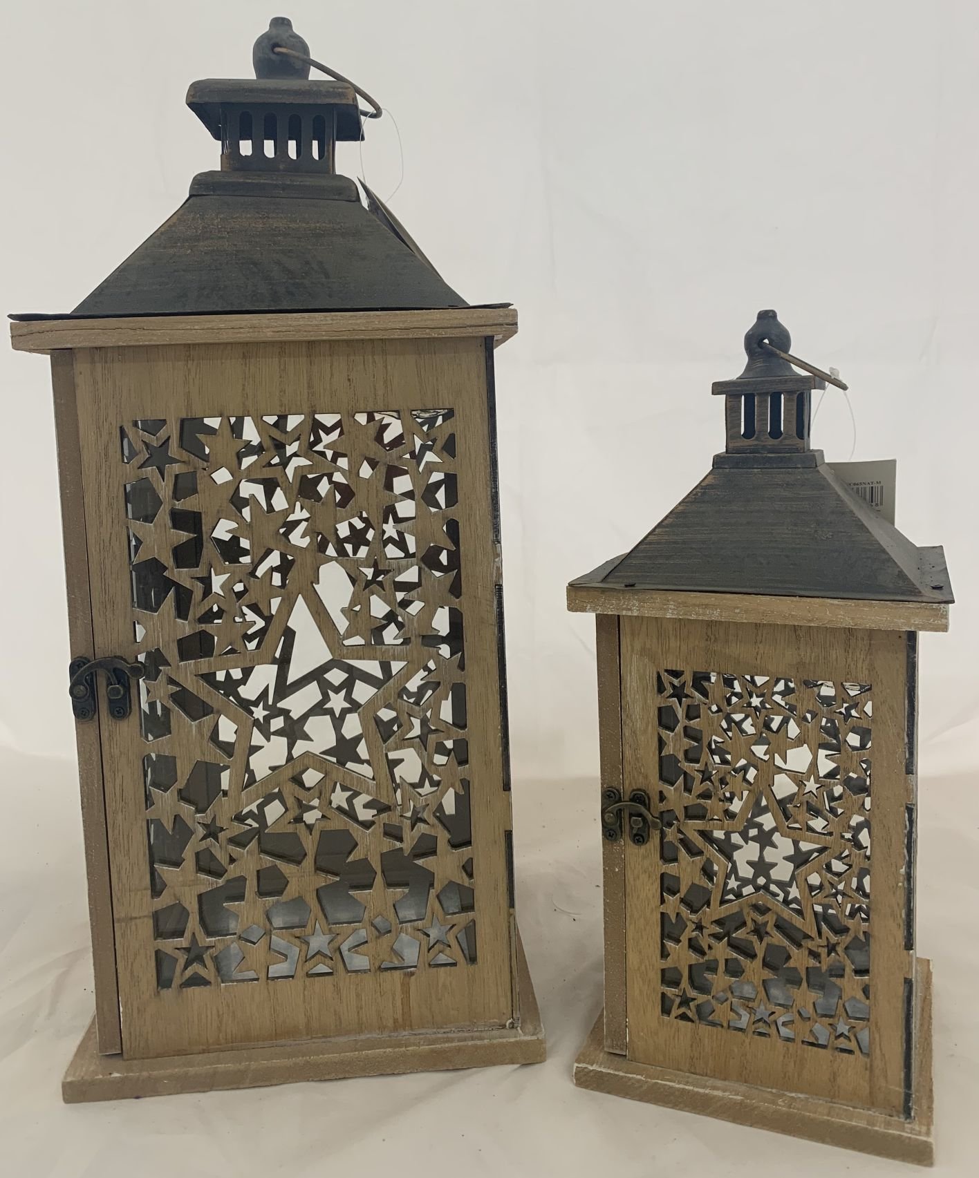 Dřevěné lucerny prosklené s hvězdami a s plechovou stříškou - sada 2 kusů. Cena za sadu. Materiál - dřevo, kov, sklo. Rozměry - velká lucerna - výška 47cm, šířka 20cm, malá lucerna - výška 32cm, šířka 12cm. przeczytaj całość