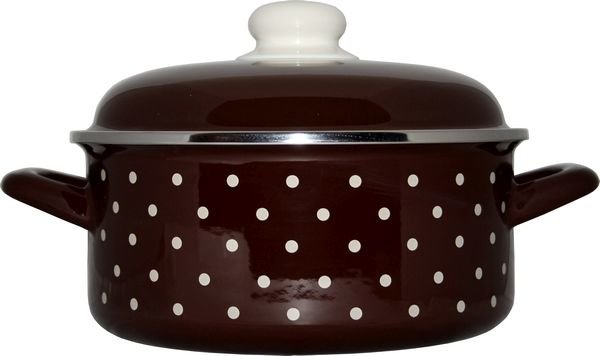 Hnědý hrnec s bílými puntíky o objemu 1,5 l, s poklicí. Je vhodný do myčky nádobí. Lze jej použít na všechny typy varných desek včetně indukce. Materiál - smalt. Rozměry - průměr 16 cm, výška 8 cm. przeczytaj całość