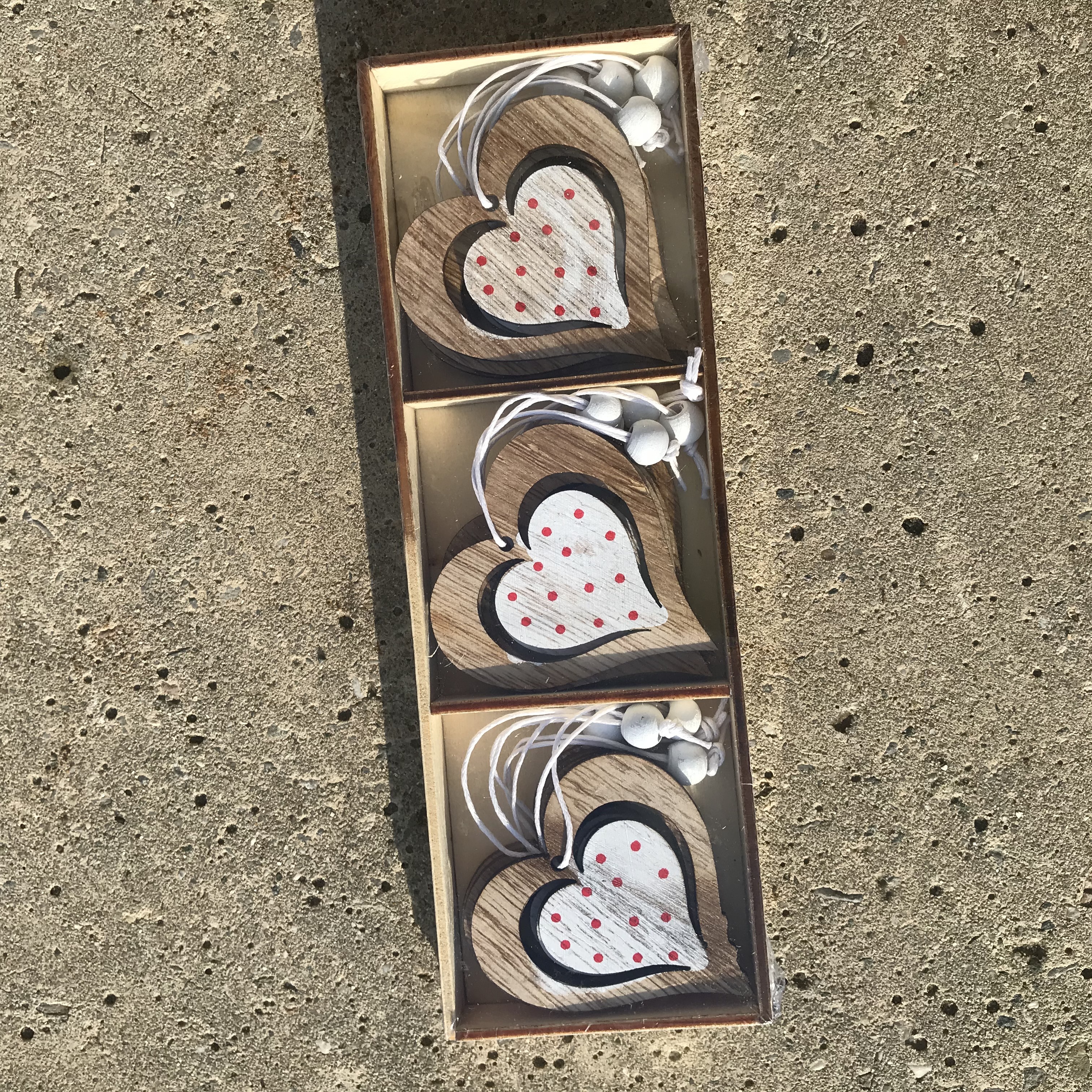 Sada dekoračních srdíček k zavěšení - 12 ks. Barva - kombinace přírodní s červenou a bílou. Materiál - na bázi dřeva. Rozměry - výška 6 cm, šířka 6 cm. przeczytaj całość