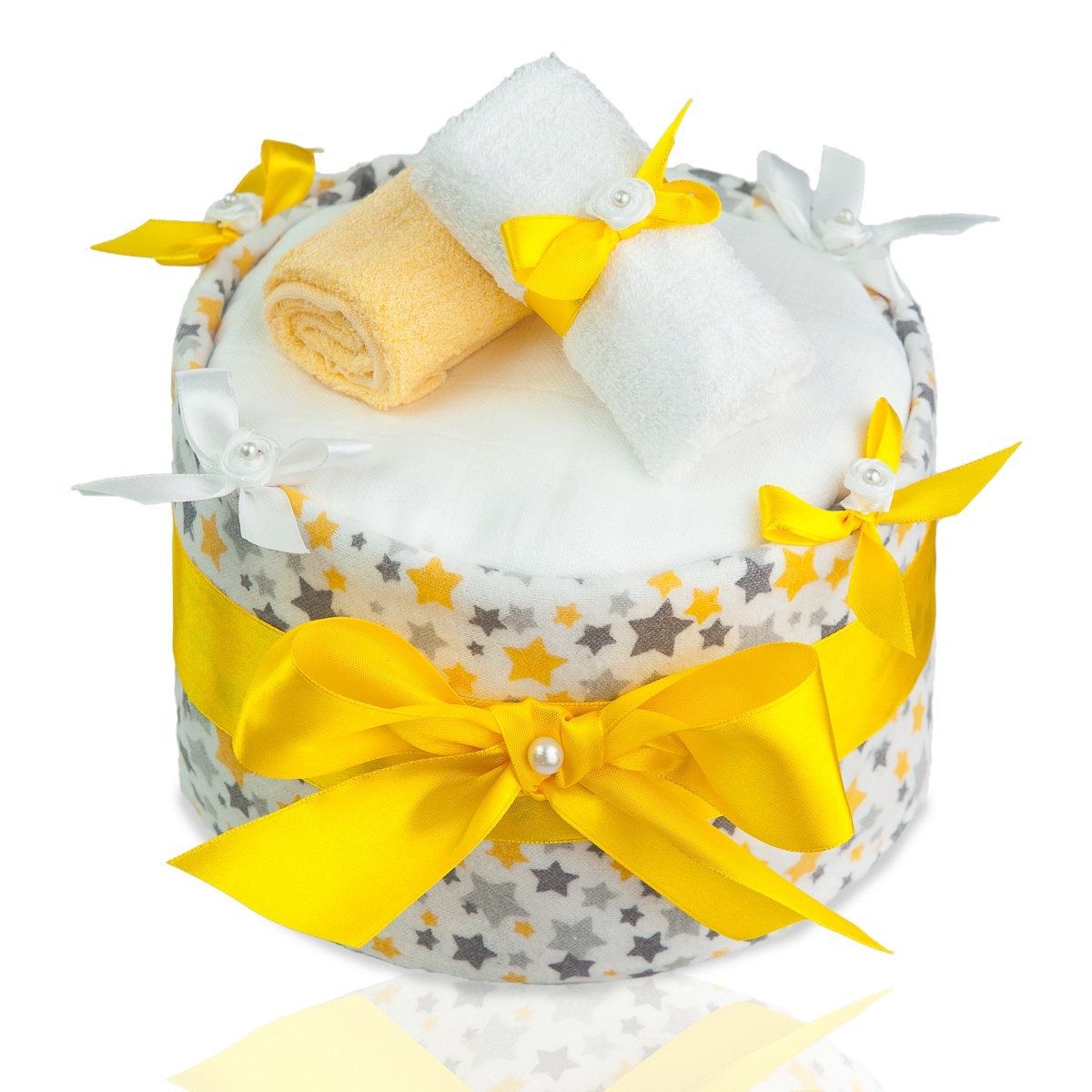Ručně vyráběný plenkový dort T-tomi je krásným dárkem pro čerstvě narozená miminka nebo maminky v očekávání. Je balen v dárkové krabici s visačkou, na kterou je možné napsat vlastní věnování.