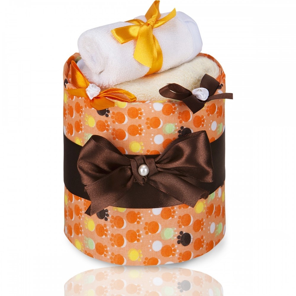 Ručně vyráběný plenkový dort T-tomi je krásným dárkem pro čerstvě narozená miminka nebo maminky v očekávání. Je balen v dárkové krabici s visačkou, na kterou je možné napsat vlastní věnování.