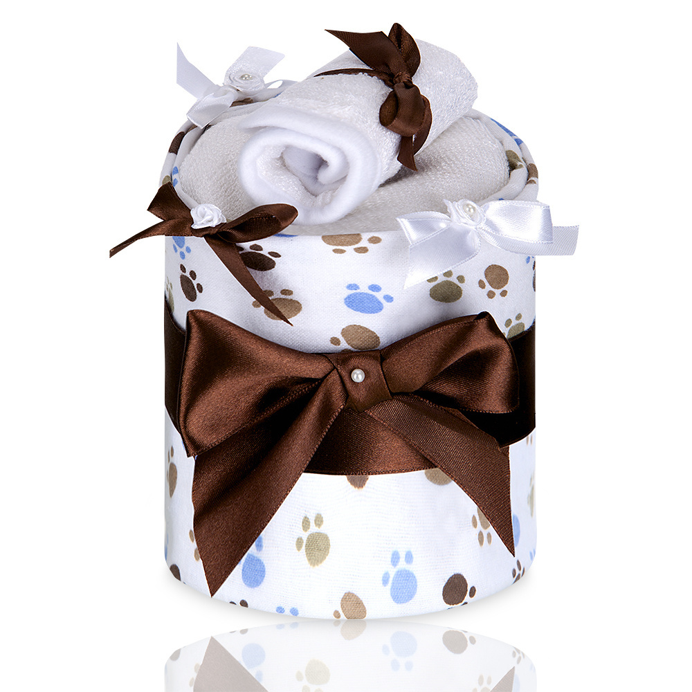 Ručně vyráběný plenkový dort T-tomi je krásným dárkem pro čerstvě narozená miminka nebo maminky v očekávání. Je balen v dárkové krabici s visačkou, na kterou je možné napsat vlastní věnování.