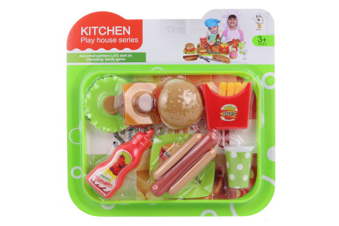 Sada potravin fastfood obsahuje hamburger který se dá rozložit na jednotlivé přísady ( houska, salát, karbanátek, sýr, rajče, majonéza), hranolky v kelímku, párek v rohlíku, nápoj, kečup, tácek. Rozměr balení cca 31 x 31 x 5 cm. Věk 3+ przeczytaj całość