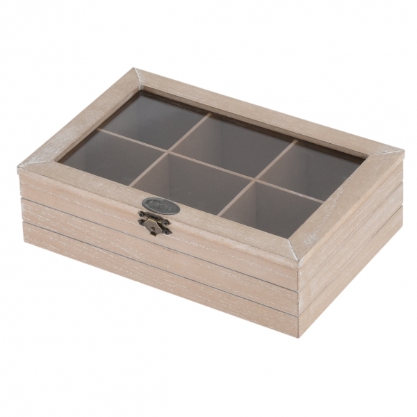 Kazeta na čajové sáčky je rozdělena do 6 sekcí. Hosté si mohou vybrat svou oblíbenou příchuť čaje. Průhledné víko. Matriál: lisované dřevo s povrchovou úpravou, plast, kovové zavírání. Rozměry: 24x16x7 cm. przeczytaj całość