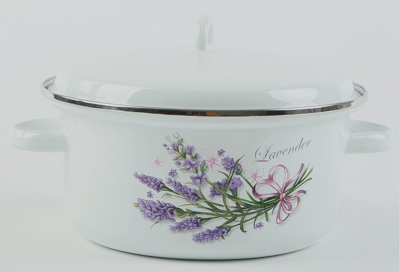 Smaltovaný hrnec bílý s motivy levandule s pokličkou. Vhodný na všechny typy varných ploch včetně indukce. Materiál - smalt. Rozměry - objem 3 l, výška 11,4 cm, průměr 21 cm. przeczytaj całość
