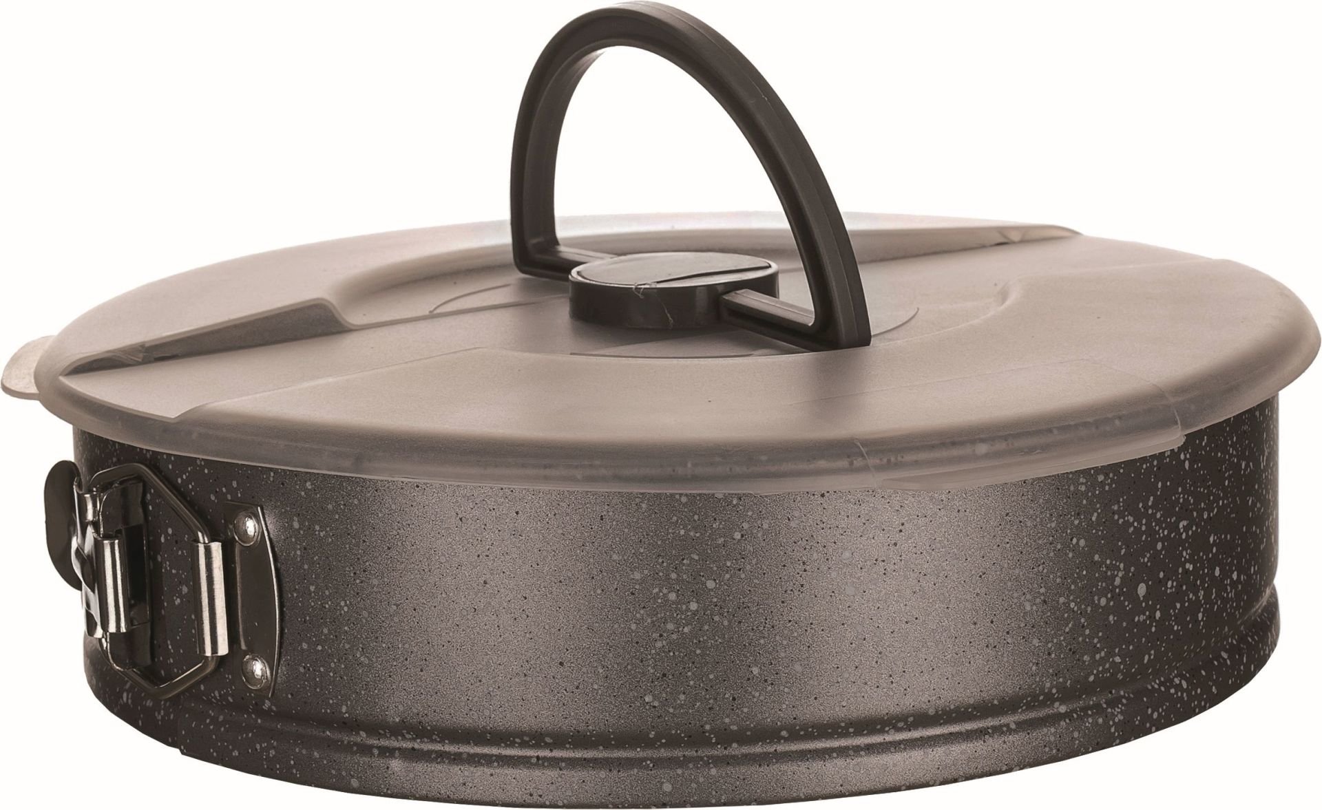 Forma na dort s plastovým víkem Granite. Materiál - nepřilnavý povrch XYNFLON je vyroben na bázi PTFE - polytetrafluorethylen, je vysoce odolný, má prvotřídní antiadhézní vlastnosti a snadno se udržuje, poklice - plast. Rozměry - průměr 26cm, výška 8cm, tloušťka stěny 0,4mm. przeczytaj całość