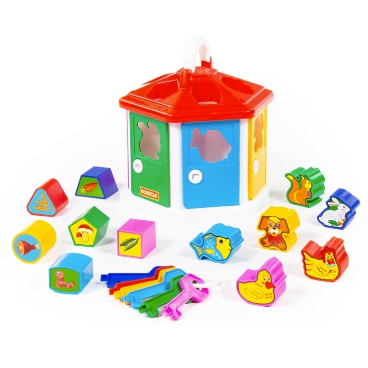 Zabawka dydaktyczna - wkładanka, domek z plastiku, w zestawie kluczyk do drzwiczek i 12 elementów do wkładania. Wspomaga rozwój umiejętności, rozróżnianie kształtów i kolorów.Wyprodukowano na licencji Cavallino. przeczytaj całość