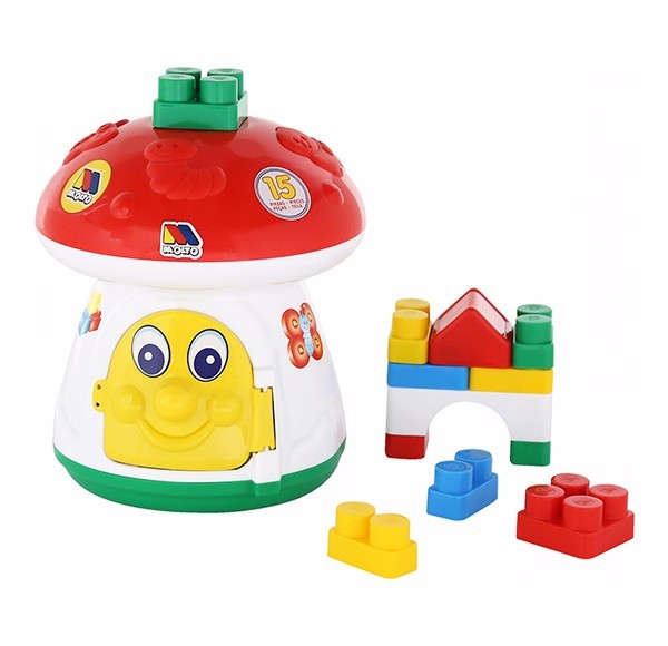 Plastový hříbek s dvířky a okénkem, na hříbku dítě najde tvary ptáčka, berušky, motýla a housenky. Je tam také základ pro upevnění části dílu stavebnice, která má 15 částí o rozměrech 6 x 6 cm. Hračka je určena pro děti od 1 roku a podporuje rozvoj motoriky, fantazii a rozeznávání barev.Balení v... przeczytaj całość