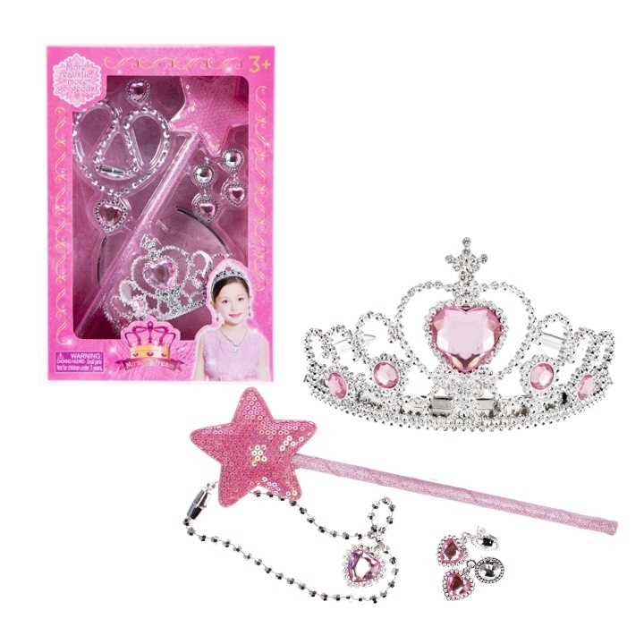 Vaše slečna se může cítit jako skutečná princezna, náušnice zapnuté sponkou. Sada obsahuje: diadém, náhrdelník, hůlku a náušnice. Všechny prvky jsou vyrobeny z plastu. Rozměry produktu [cm]: diadém-12x10x12, žezlo- 27 cm, rozměry balení: 19x28x6cm, nevyžaduje baterie. Výrobek je určen pro děti ve věku od 3 let. Sada je zabalena v krabici s okénkem.