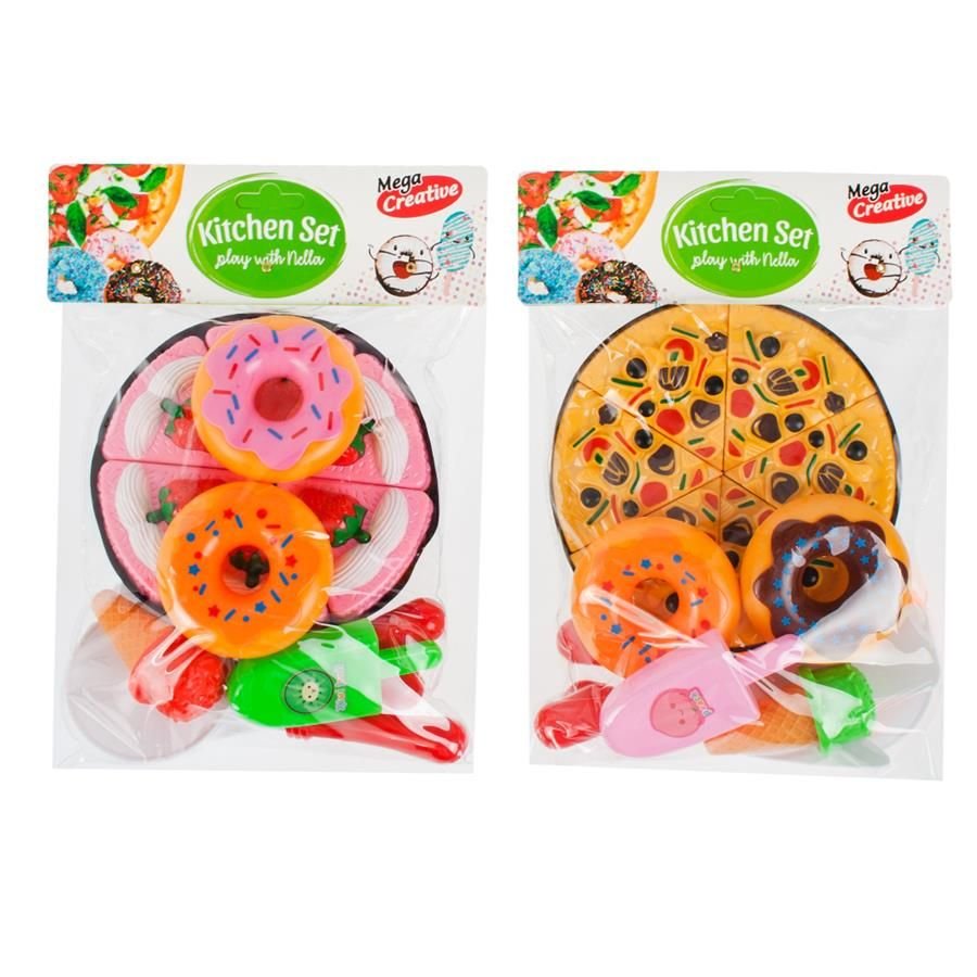 S kuchyňskou sadou MEGA CREATIVE nikdy nebudete mít hlad! Co se vám líbí? Možná pizzu nebo dort? Sada zahrnuje napodobeniny potravinářských výrobků a hotových jídel, jako je pizza, dort nebo koblihy a kuchyňské doplňky. Hračky z plastu. K dispozici jsou dva různé modely. Určeno pro děti od 3 let....