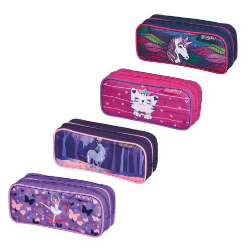 20,5 x 7 x 9 cm, dvě kapsy na zip, materiál: polyester, mix motivů: jednorožec, kočka, fantazie, víla przeczytaj całość
