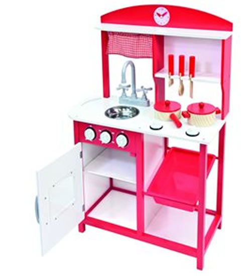 Barevná dřevěná kuchyňka s vybavením 5ti dílů kuchyňského náčiní a potřeb na vaření. Dětská kuchyňka má sporák, troubu, dřez na mytí nádobí, poličku a úložnou skříňku pro ukládání kuchyňského náčiní. Kuchyňka nemá elektronické funkce.. Věk: 3+ . Materiál: dřevo . Rozměry: 60 x 83 x 27 cm przeczytaj całość