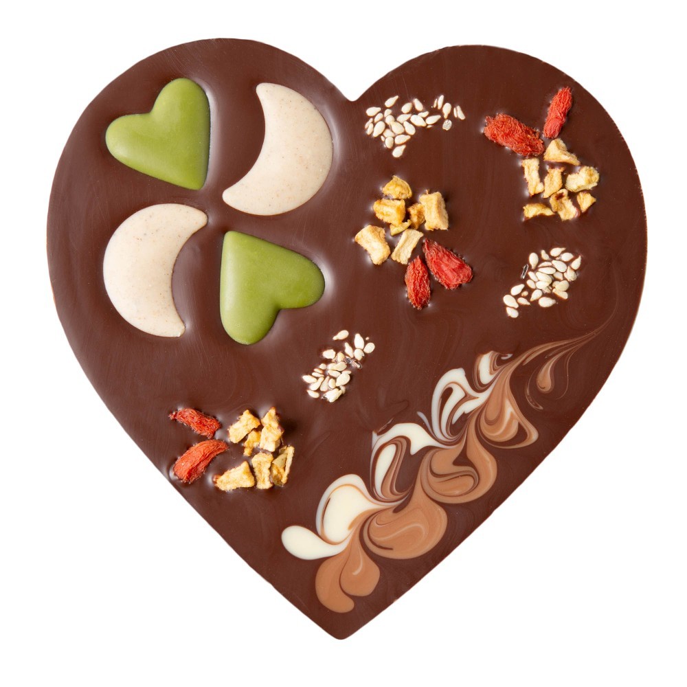 Nádherné veganské vánoční bio čokoládové srdce z hořké čokolády se 70 % fair trade kakaa a něžně se rozplývajícího nugátu s vlašskými ořechy. Je zdobené dvěma měsíci z bílé kokosové čokolády, dvěma čokoládovými srdíčky se zeleným čajem, červenými plody goji, praženými křupavými sezamovými semínky...