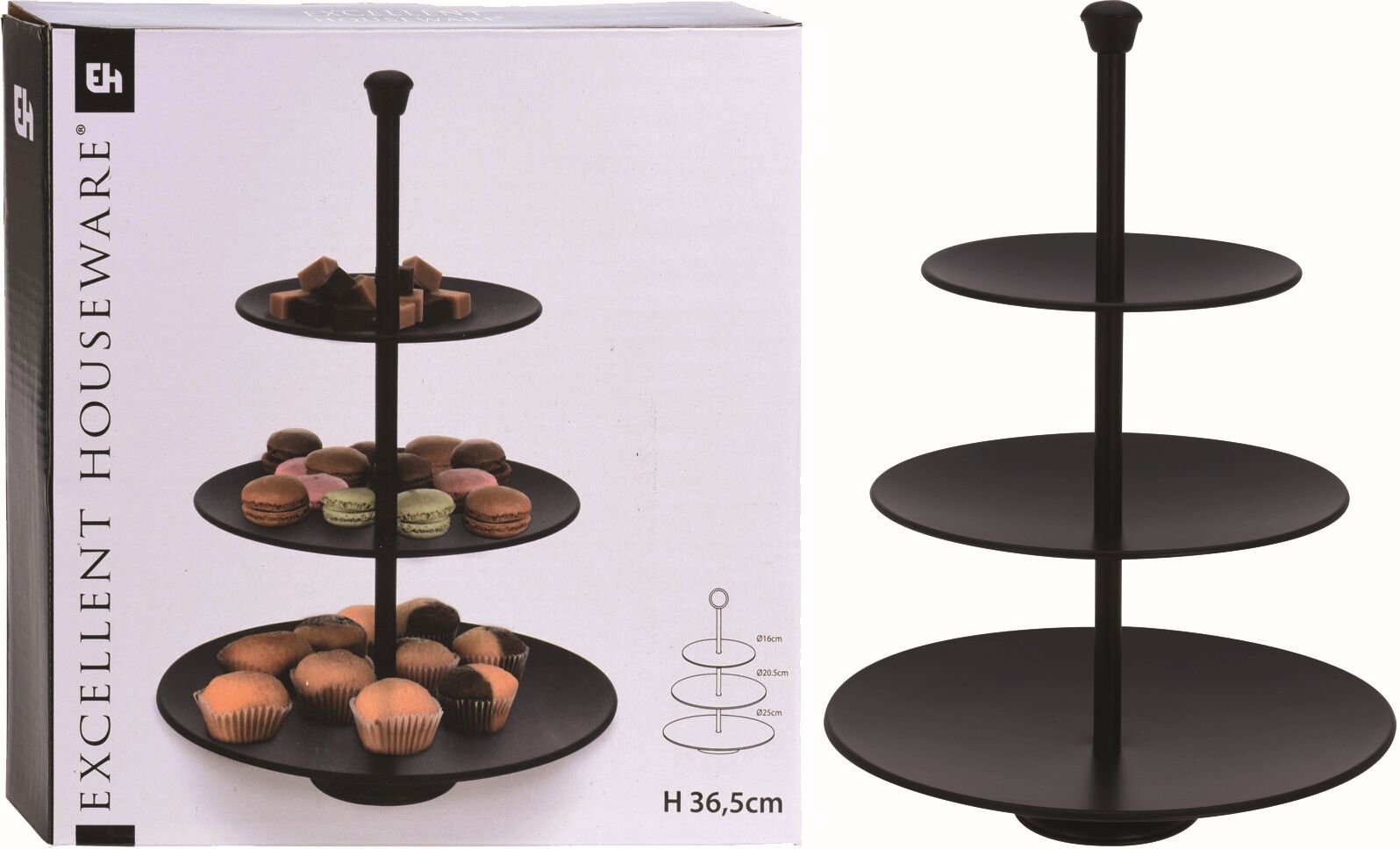 Patera trzypoziomowa oferuje praktyczne i jednocześnie dekoracyjne rozwiązanie do prezentacji Twoich deserów. Dzięki warstwowej konstrukcji oszczędza miejsce na stole i pozwala jednocześnie zaprezentować różne rodzaje słodkości lub drobnych przekąsek. Czarny kolor patery doda każdemu stołowi nowoczesnego i wyrafinowanego wyglądu, odpowiedniego zarówno na rodzinne uroczystości, jak i na bardziej formalne okazje.