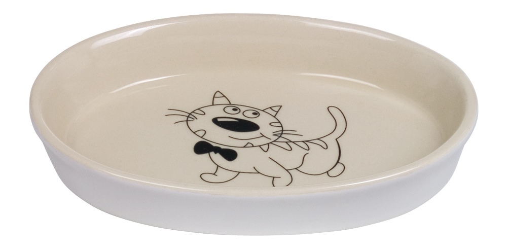 Wyprodukowana z wytrzymałej ceramiki. Nadaje się do zmywarki lub kuchenki mikrofalowej. Ta miska ma stosunkowo dużą wagę własną, dzięki czemu jest stabilna i dobrze trzyma się na miejscu. Rozmiar 17 x 11 cm, wysokość 2,5 cm. Miskę należy myć po każdym karmieniu, ponieważ koty mogą odmawiać jedzenia z miski, w której wyczuwają resztki. Koty wolą, aby miska z jedzeniem nie była umieszczona blisko miski z wodą