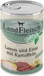 Konzerva Landfleisch jehněčí a kachní maso s brambory a zeleninou. Kompletní krmivo pro dospělé psy všech plemen. Landfleisch konzervy jsou exkluzivně vyráběny z čerstvého masa a čerstvé zeleniny. Všechny suroviny pocházejí z přírody z německých farem. Obsahuje pouze čerstvé maso z jatečných...
