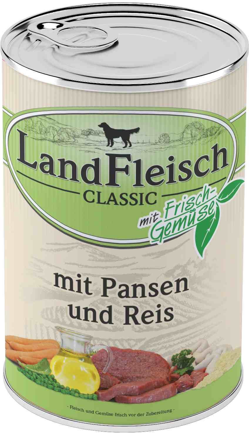 Konzerva Landfleisch s dršťkami, rýží a zeleninou. Kompletní krmivo pro dospělé psy všech plemen. Landfleisch konzervy jsou exkluzivně vyráběny z čerstvého masa a čerstvé zeleniny. Všechny suroviny pocházejí z přírody z německých farem. Obsahuje pouze čerstvé maso z jatečných zvířat...