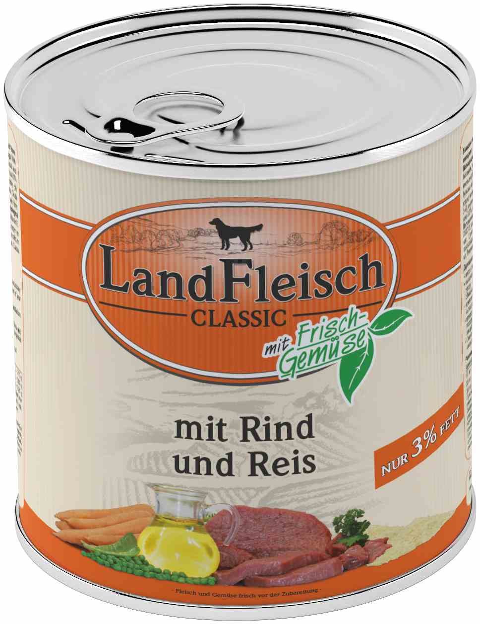 Konzerva Landfleisch s hovězím masem, rýží a zeleninou. Kompletní krmivo pro dospělé psy všech plemen. Landfleisch konzervy jsou exkluzivně vyráběny z čerstvého masa a čerstvé zeleniny. Všechny suroviny pocházejí z přírody z německých farem. Obsahuje pouze čerstvé maso z jatečných zvířat...