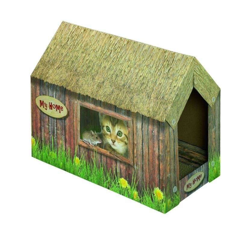 Domek dla kota wykonany z wytrzymałego kartonu. Wewnątrz domku znajduje się kartonowe drapisko (pozwala kotu zaspokajać naturalne potrzeby drapania, bez niszczenia mebli lub dywanów). Domek dostarczany jest razem z suszoną kocimiętką (zapach kocimiętki, przypominający miętę pieprzową, nieodparcie przyciąga większość kotów). Wymiary 49 x 26 x 36 cm.