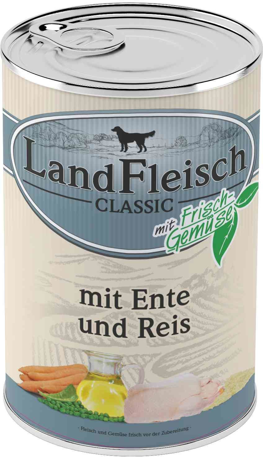Konzerva Landfleisch kachní maso s rýží a zeleninou. Kompletní krmivo pro dospělé psy všech plemen. Landfleisch konzervy jsou exkluzivně vyráběny z čerstvého masa a čerstvé zeleniny. Všechny suroviny pocházejí z přírody z německých farem. Obsahuje pouze čerstvé maso z jatečných zvířat...