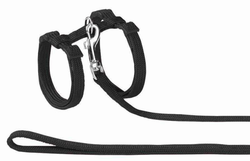 Nylonový set postroje a vodítka pro kočku. Univerzální nastavitelná velikost postroje 37-47cm. Délka vodítka 120cm. Šíře 10mm. Barva černá. przeczytaj całość