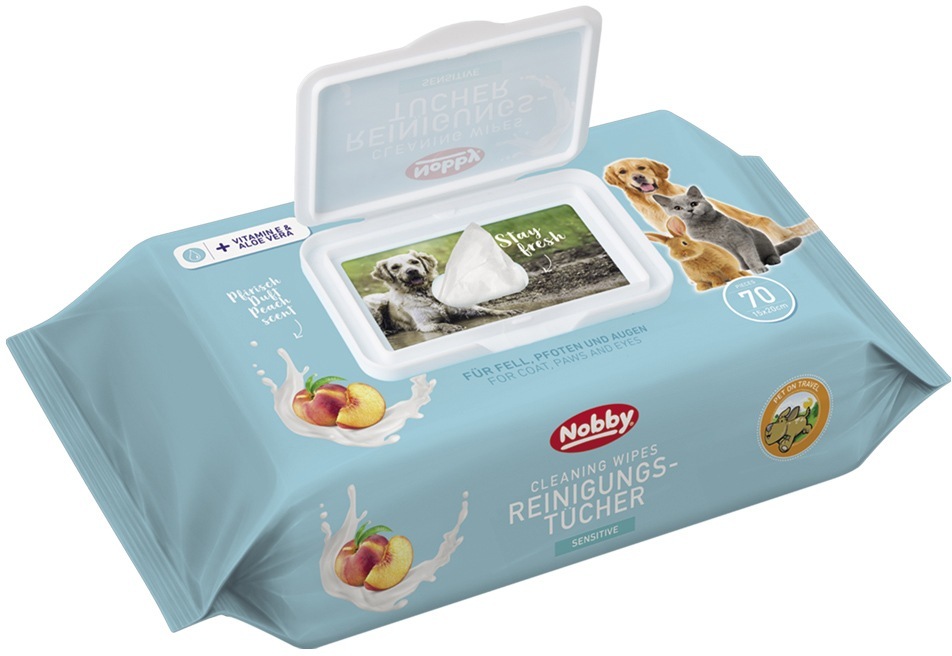 Delikatne wilgotne chusteczki Nobby dla psów i kotów. Z delikatnym zapachem brzoskwini. Szczególnie delikatne dzięki witaminie E i ekstraktowi z aloesu. Chusteczki nadają się do higieny psów, kotów i szczeniąt. Szybko i delikatnie oczyszczają sierść, łapy, skórę, pachwiny oraz inne części ciała. Można je używać także w wrażliwych obszarach (oczy i uszy). Ich użycie jest całkowicie bezpieczne. Są idealnym pomocnikiem podczas podróży. Opakowanie: 70 sztuk, rozmiar chusteczki: 20 x 15 cm Instrukcja użycia: Nie używaj tej samej chusteczki do oczu i uszu; po użyciu wyrzuć. Po otwarciu zużyć w ciągu 3 miesięcy Ostrzeżenie: Chronić przed światłem i wszelkimi źródłami ciepła. Tylko do użytku zewnętrznego. Przechowywać poza zasięgiem dzieci. Użytej chusteczki nie wrzucać do toalety. Data produkcji podana na opakowaniu.