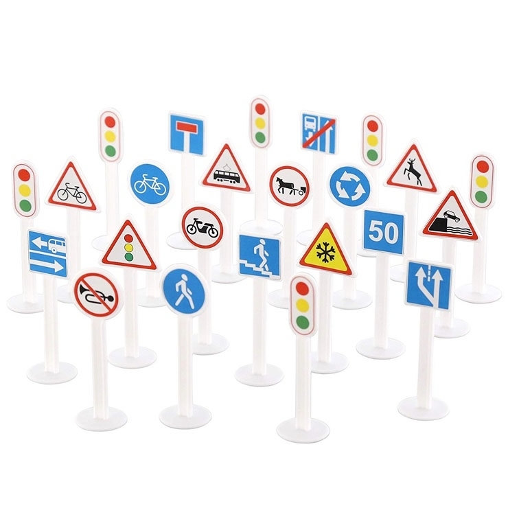 - Kompletny zestaw 24 elementów obejmuje podstawowe i najczęściej stosowane znaki drogowe.