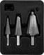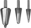 Sada 3 ks stupňovitých kuželových vrtáků na kov umožňující postupné vyvrtání více průměrů otvorů.