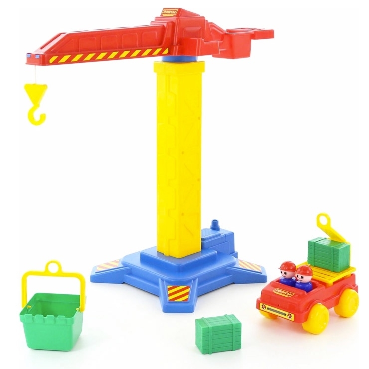 Dětský věžový jeřáb s autem je s rozměry 66 x 30 x 56 cm v balení s autem 20 x 14 cm velkým. Jeřáb má rameno výložníku 61 cm dlouhé s ručním mechanismem zvedání a spouštění břemene, ovládaným klikou. Celková výška jeřábu je 56 cm. V balení jsou i figurky řidiče a jeřábníka a břemena. przeczytaj całość