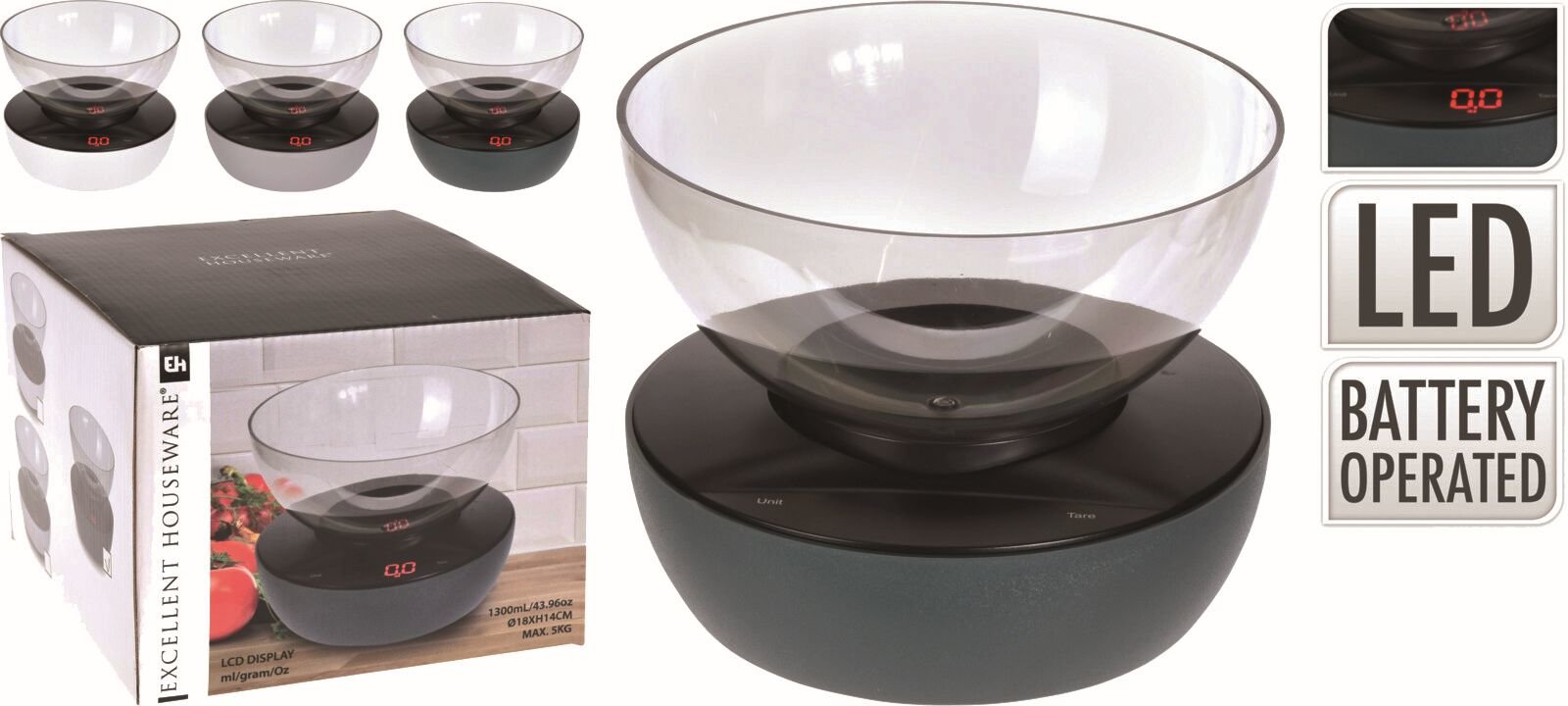 Kuchyňská digitální váha s displejem a transparentní odnímatelnou miskou, s možností vážit v kg, g, a oz až do 5 kg. Možnost vynulování a dovažování funkcí TARE. Miska o objemu 1300 ml. Rozměry - průměr 18 cm, výška 14 cm. przeczytaj całość