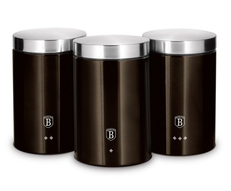 sada 3 kusů designových dóz na potraviny v černém provedenítělo i víko jsou vyrobené z nerezové oceliurčené především pro skladování suchých potravindózy jsou ideální na kávu, čaj, cukr, mouku, tětoviny, bylinky, skořápkové plody, atd..stylové řešení jak uchránit potraviny před vlhkostí,...