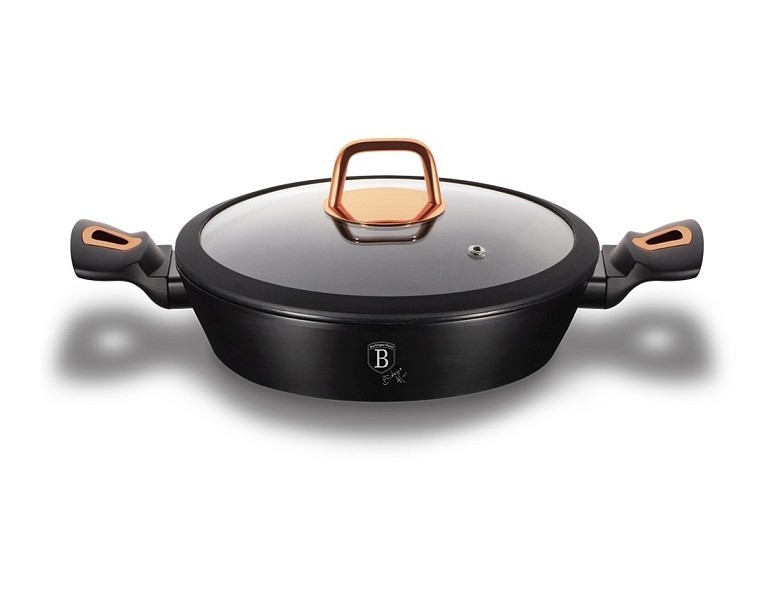 materiál: kovaný hliník s mramorovým povrchemprůměr: 28 cmvýška: 7,5 cmobjem: 3,8 lbarva: černá/rosegoldžáruvzdorná poklice se silikonovým okrajem3vrstvý nepřilnavý povrch s mramorovým designemergonomické měkčené rukojetiTURBO indukční dnovhodné na všechny druhy ohřevu i na indukcivhodné do myčky...