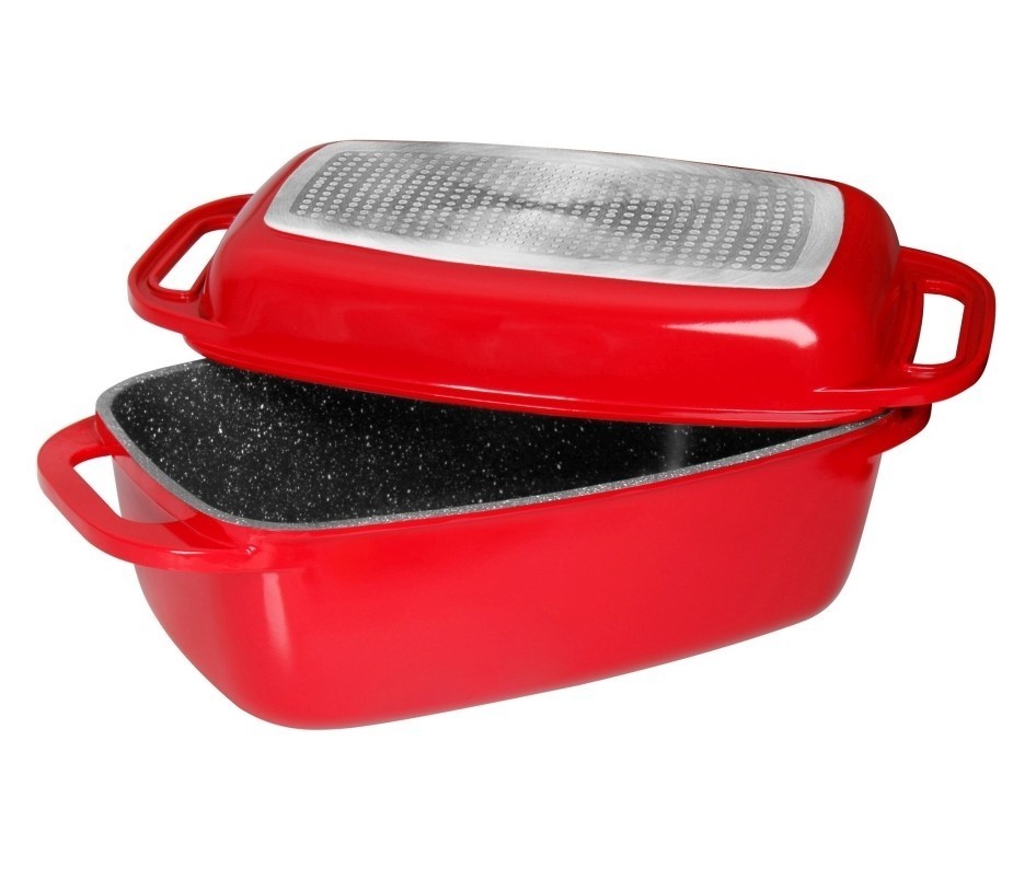 obddelníkový pekáčvnějšá barva červená materiál - litý hliníkpoklice s indukční deskou a vnitřním nepřilnavým povrchem s mramorovým designem vaření bez tuku šetrný k vitamínům kovové úchyty extra silný , nezdeformovatelný odolný jako kámen absolutně odolný proti poškrábání díky nepřilnavému...