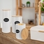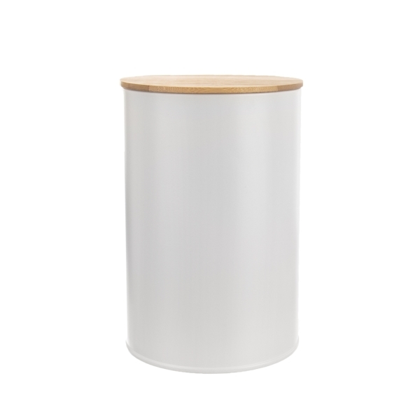 Dóza s víčkem na uložení čaje, kávy... Materiál: plech, bambus, silikon - těsnění. Rozměry: o. 0,8 l, pr. 9,5 cm, v. 12,5 cm. przeczytaj całość