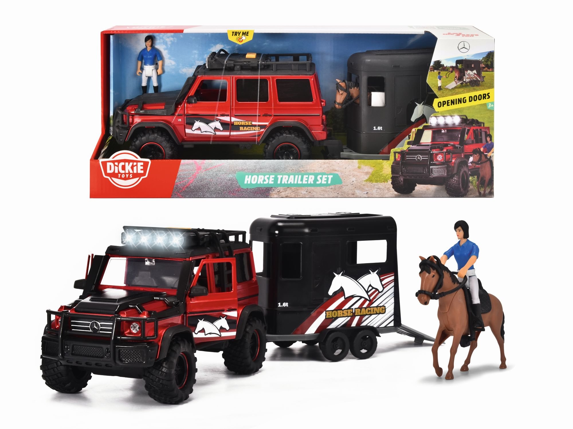 Auto Mercedes-Benz AMG 500 4x4 na volnoběh s přívěsem, včetně koně, s otevíracími dveřmi, se zvukovými a světelnými efekty, s kloubovou figurkou žokeje. V měřítku 1:24. Délka 40 cm. przeczytaj całość