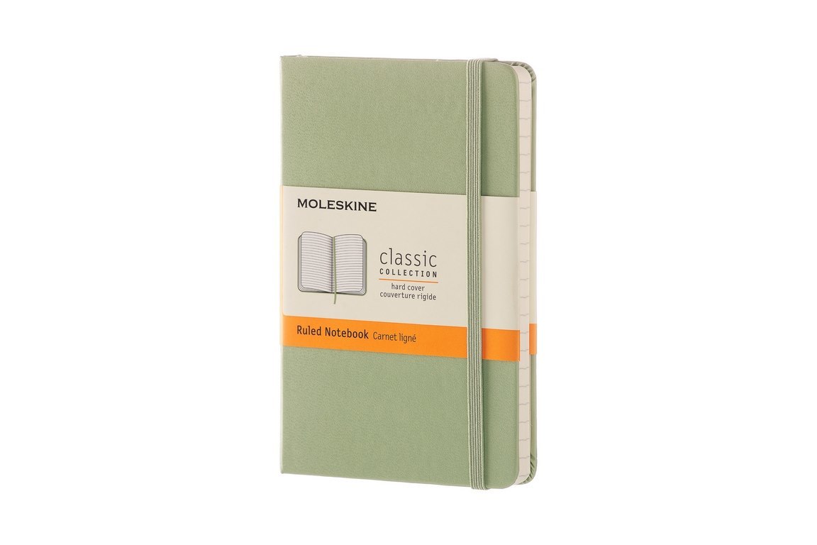 Moleskine brings more color to its notebooks. This Willow Green version of the classic Ruled Pocket Notebook is perfect for writings, thoughts and passing notes. The color-coded bands reveal the notebook's layout. The back of the paper banderole can be saved for later use. The ribbon, bookmark...