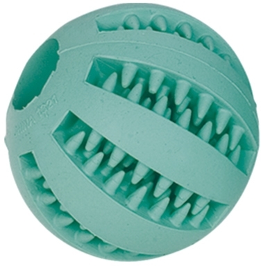 Zabawka gumowa piłeczka z miętą dla psów. Zabawka wykonana jest z miękkiego naturalnego kauczuku. Specjalne rowki pomagają podczas zabawy w utrzymaniu prawidłowej higieny jamy ustnej, zapobiegają powstawaniu kamienia nazębnego i płytki nazębnej oraz przyjemnie masują dziąsła. Aromat mięty zapewnia świeży oddech. Nietoksyczna, zmywalna wodą. Wielkość ø 5 cm. Uwaga: zabawka przeznaczona do używania pod nadzorem. Usuwaj zabawkę zwierzęciu, jeśli jest uszkodzona. Zabawki są wykonane z materiałów wysokiej jakości i wytrzymałych, przeznaczonych do żucia, jednak nie są przeznaczone do intensywnego żucia. Nie przeznaczone dla dzieci.
