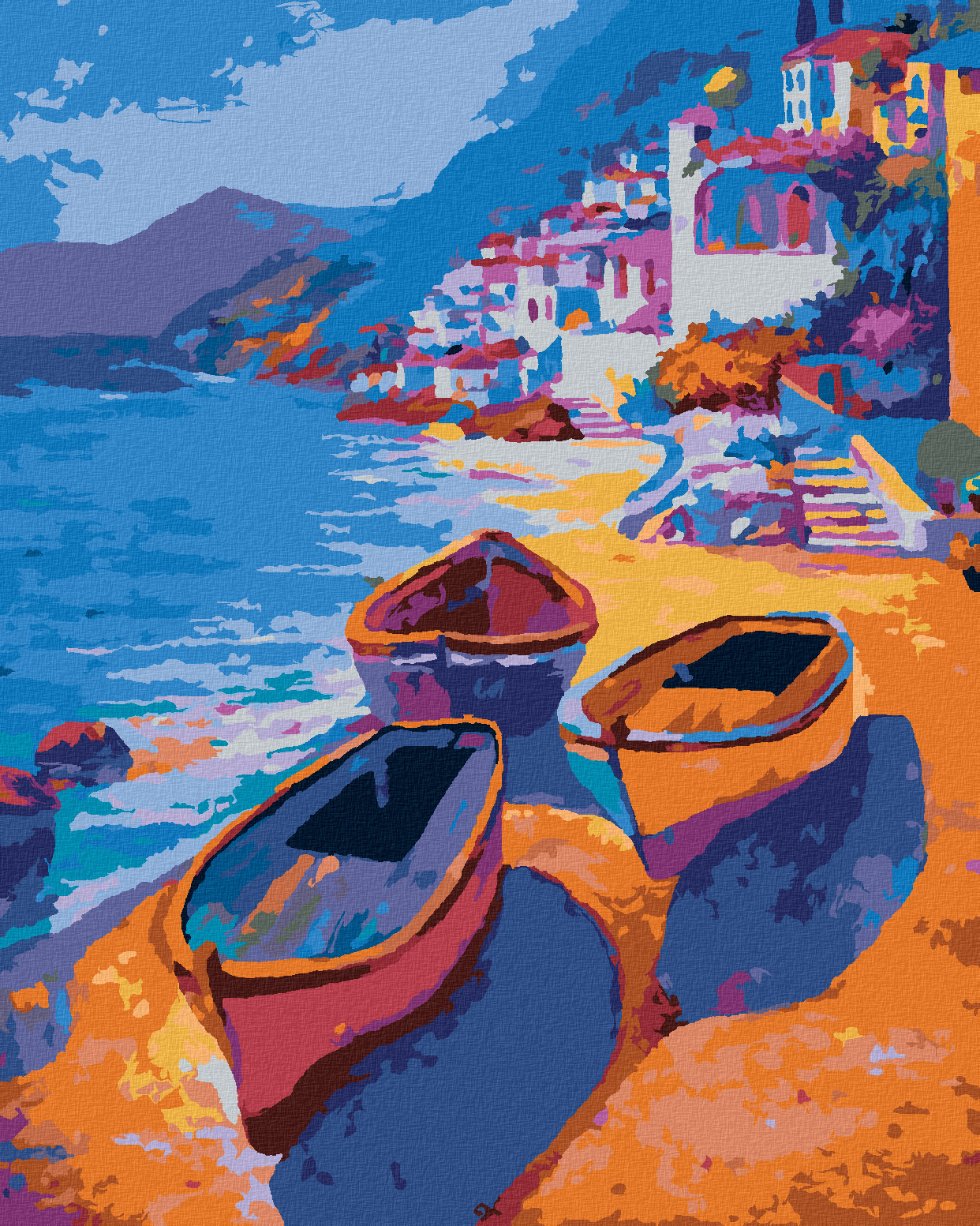 Malování podle čísel - BAREVNÉ LOĎKY NA BŘEHU - 80x100 cm, bez rámu a bez vypnutí plátna