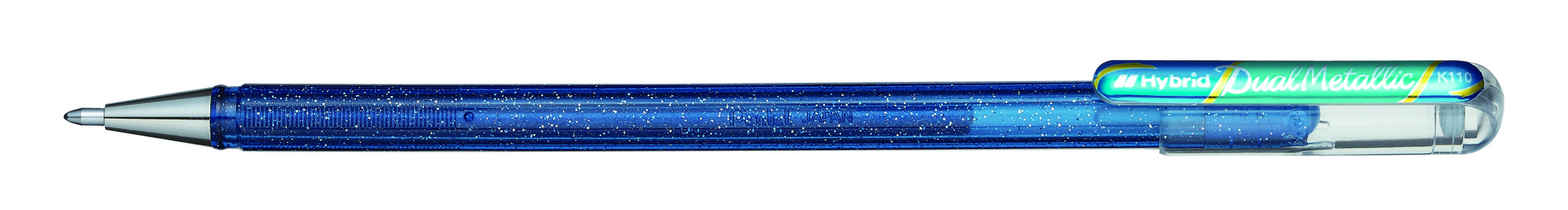 Fantastyczny żelowy długopis Pentel Hybrid Dual Metallic. Błyszczący, kryjący ślad zmienia kolor w zależności od użycia na białym lub czarnym papierze. Idealne zastosowanie do ozdobnego pisma, podkreślania, zdobienia i rysowania. Wytrzymały plastikowy korpus z nasadką. Atrament na bazie wody, można go na papierze akwarelowym rozmyć do zera, ale efekty błyszczące pozostają. Brokat można też usunąć z kulki końcówki delikatnym nylonowym pędzelkiem Pentel Aquash i pracować z nim jako z dekoracją. Alternatywnie rysować na gładkiej folii i z niej za pomocą pędzelka Pentel Aquash pobierać kolorowy ślad i brokat. Nadaje się do krasopisu, bullet journala, zdobienia, dekoracji, wyróżniania, tworzenia. Przyjemny sześciokątny uchwyt. Stożkowa końcówka ze śladem 0,9 mm.