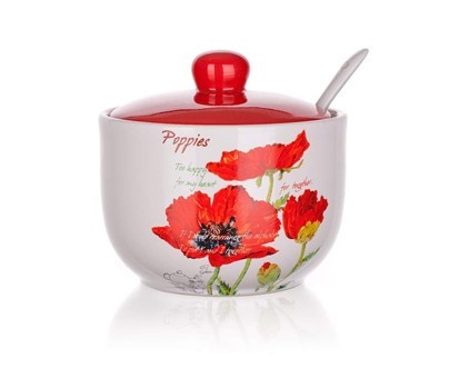 Cukřenka se lžičkou Red POPPY. Bílá glazura s dekorem vlčích máků, červené víčko. Materiál - keramika. przeczytaj całość