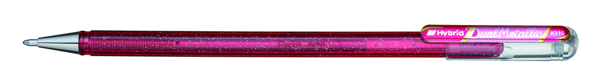 Niesamowity długopis żelowy Pentel Hybrid Dual Metallic. Błyszczący kryjący ślad zmienia kolor w zależności od zastosowania na białym lub czarnym papierze. Idealny do ozdobnego pisma, podkreślania, zdobienia i rysowania. Trwałe plastikowe korpus z nasadką. Tusz na bazie wody, można go rozmywać na papierze akwarelowym aż do zaniku, ale efekty brokatu pozostają. Brokat można także zdjąć z kulki końcówki delikatnym nylonowym pędzelkiem Pentel Aquash i używać go jako dekoracji. Alternatywnie rysować na gładkiej folii i za pomocą pędzelka Pentel Aquash pobierać z niej barwny ślad i brokat. Nadaje się do kaligrafii, bullet journala (bujo), zdobienia, dekoracji, wyróżniania, tworzenia. Przyjemny sześciokątny uchwyt. Stożkowa końcówka o grubości 0,9 mm.